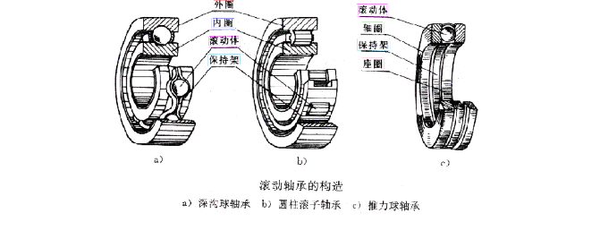滾動軸承一般由外圈、 內圈、 滾動體 和 保持架 四部分組成,嚴格的說是由外圈、內圈、滾動體、保持架、密封、潤滑油 六大件組成。簡單來說,只要具備外圈、內圈、滾動體就可定義為為滾動軸承。按滾動體的形狀,滾動軸承分為 球軸承 和 滾子軸承 兩大類。