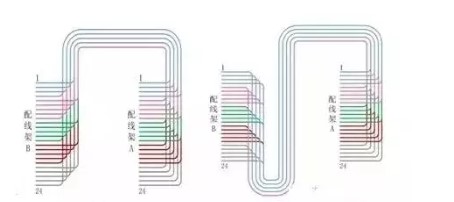 根據圖示,在A配線架上雙絞線的排列為1號線先出現,其他線按順序出線,排列整齊;在B配線架上為24號線先出線,改為了下出線方式,由于上層的線全部覆蓋在所有的線上,保持了一層完全平整的斜線,所以在B配線架上依舊美觀。