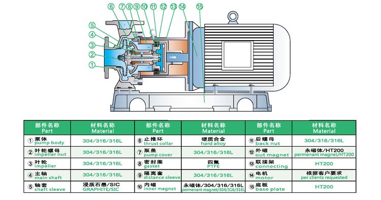 WJC不銹鋼磁力泵過流部件采用全不銹鋼材料(304、316、316L),內(nèi)、外磁轉(zhuǎn)子選用高磁能積、高矯頑力的稀土永磁制造,具有高效節(jié)能、介質(zhì)適用面廣、耐高溫、磁性強、不退磁等優(yōu)點,對有機酸,有機化合物,堿,中性溶液和各種氣體都有良好的耐蝕性,雙螺旋糟碳石墨軸承和硬質(zhì)合金軸套,具有較強的耐磨性,是應用磁力耦合實現(xiàn)無接觸傳動、無動密封的新型高品質(zhì)磁力化工泵。保證了產(chǎn)品的壽命,是無泄漏輸送腐蝕性介質(zhì)的理想用泵。