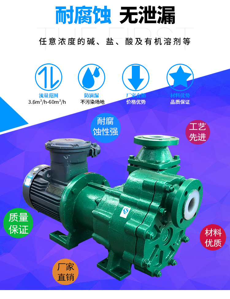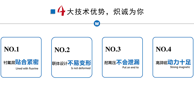 ZMD襯氟自吸磁力泵是我公司新一代耐腐蝕自吸磁力泵,它不但集氟塑料磁力泵的優(yōu)點于一身,而且具有自吸功能、無泄漏,這是以往的所有氟塑料磁力泵不能達到的,因此,該系列泵一推出就受到了廣大用戶的歡迎。該系列泵可廣泛適用于化工、有色金屬冶煉、農(nóng)藥、制酸制堿、造紙、酸洗工藝、稀土分離、電鍍、電子、化成箔、卸酸堿等行業(yè)或工作流程,是目前磁力泵品種中結(jié)構(gòu)新穎的產(chǎn)品之一,且高效節(jié)能、安全實用。