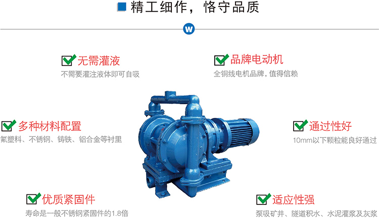 DBY 型電動隔膜泵是 一種新型的泵類。本泵應用于石化、陶瓷、冶金等行業,這種泵的主要特點是不需灌引水。直徑 在10毫米以下的顆粒、泥漿等均可以毫不費力地通過。由于隔膜將被輸送介質和傳動機械件分開,所以介質不會向外泄漏,且泵本身無軸封,使用壽命大大延 長。根據不同介質,隔膜分為氯醇橡膠、氟橡膠、丁晴橡膠等,可以滿足不同用戶的要求。