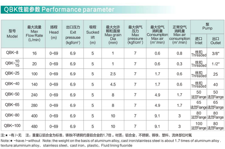 皖金泵閥氣動隔膜泵主要參數: