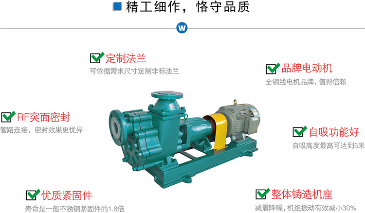 FZB氟塑料自吸泵又叫襯氟自吸泵過流部件均采用氟塑料制成,軸封采用先進的機械密封,對于輸送含雜質顆粒介質時,可配用無冷卻水單端面硬對硬(碳化硅對碳化硅)機械密封,所以用戶選型時需考慮到介質中的固體含量,方便可調。運行過程中免去了普通離心泵須倒灌安裝、灌引水、裝底閥等不便因素。這種防腐自吸泵廣泛用于酸洗工藝、制酸制堿、化工、農藥、造紙、電子等行業。